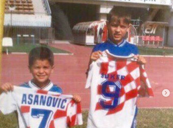 Na fotografiji pozira uz još jednog dječaka, dok drže dresove Asanovića i Šukera.