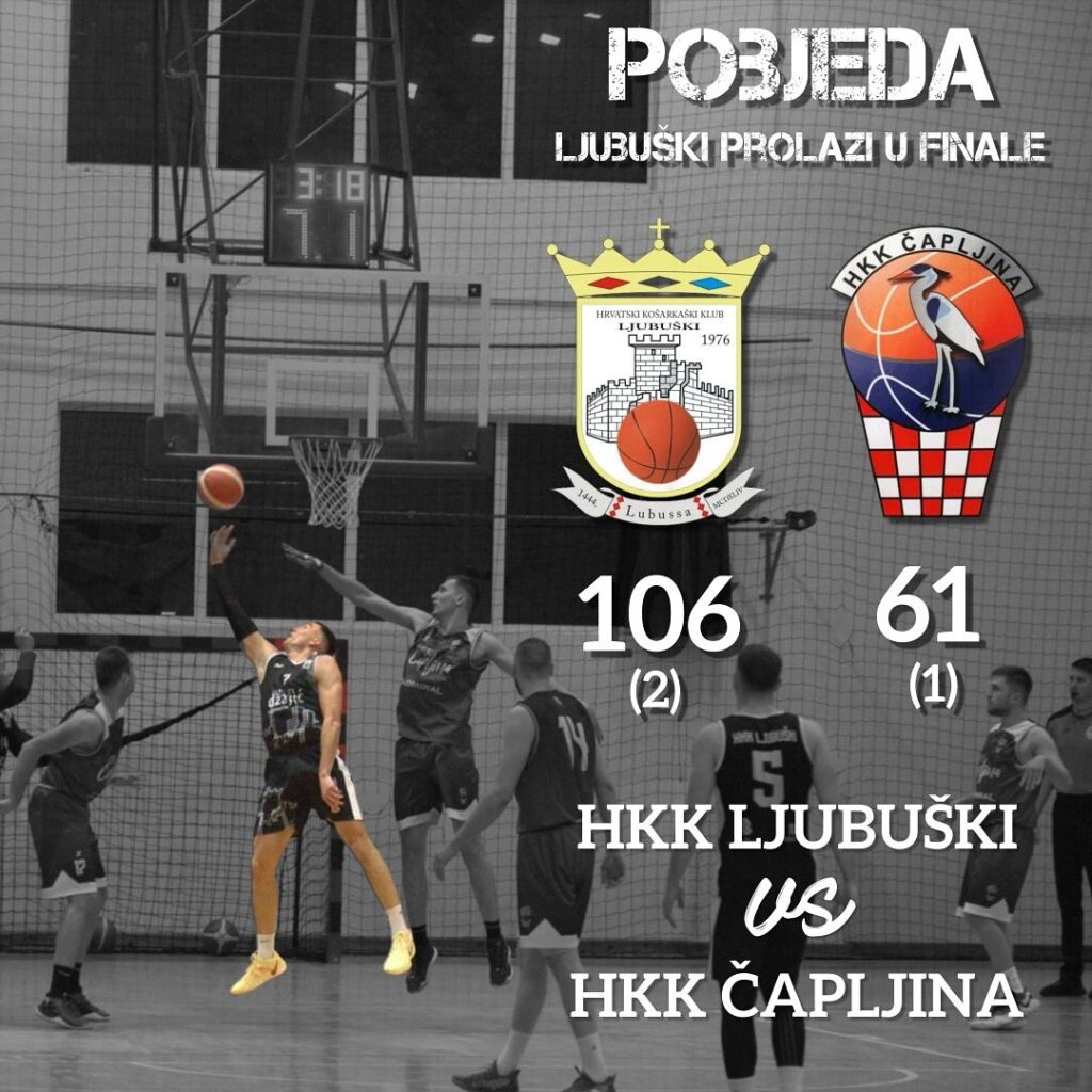 Košarkaši Ljubuškog su u trećoj  polufinalnoj utakmici doigravanja za prvaka Herceg – Bosne uvjerljivo svladali Čapljinu 106:61 i plasirali se u finale tog natjecanja gdje ih čeka momčad Zrinjskog1992 iz Mostara. Rezultat utakmice Ljubuški – Čapljina po četvrtinama: 22:15, 30:20, 32:13 i 22:13.
