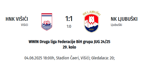 Nogometaši Ljubuškog su jučer u odgođenoj utakmici 29. kola Druge lige F BiH – skupina Jug u Višićima odigrali 1:1 protiv istoimenog domaćina. Na poluvremenu su domaćini vodili 1:0.
