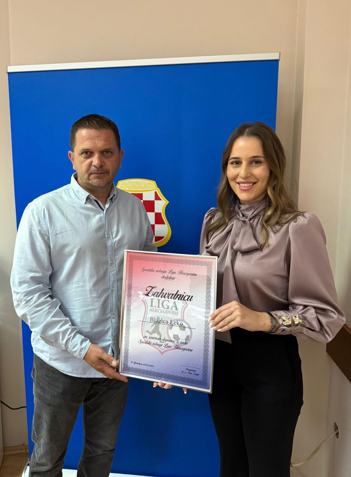 Ministrica financija i dopredsjednica Vlade Županije Zapadnohercegovačke Blagica Leko sastala se danas s predstavnicima sportske udruge „Liga Hercegovine“ Ivanom Zeljkom i Nikicom Šiljegom. Sastanak je upriličen u prostorijama Ministarstva financija ŽZH u Ljubuškom. Ministrica Leko je ovaj susret iskoristila da predstavnicima sportske udruge „Liga Hercegovine“ čestita na još jednom uspješno organiziranom malonogometnom turniru „Liga Hercegovine“. Riječ je o turniru koji je postao tradicionalan, te svake godine bilježi sve veću posjećenost.