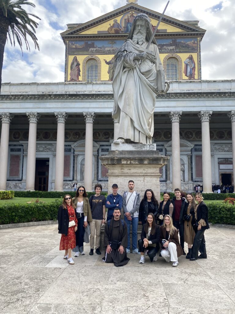 Prva postaja na ovom hodočasničkom putu bila je Bazilika svetog Pavla izvan zidina, jedna od četiri velike papinske bazilike u Rimu. Na tom se mjestu, prema predaji, nalazi grob svetog Pavla apostola. Bazilika, koju od 10. stoljeća opslužuju benediktinski redovnici, tijekom povijesti je doživjela brojna oštećenja, uključujući i veliki požar 1823. godine, ipak, uz pomoć mnogih donatora, među kojima je i hrvatski biskup Josip Juraj Strossmayer, ponovno je zasjala u svojoj veličanstvenosti. Zboraši su, uz molitvu i pjesmu, razgledali mozaike, oltar i relikvije koje svjedoče o tisućljetnoj povijesti Crkve.