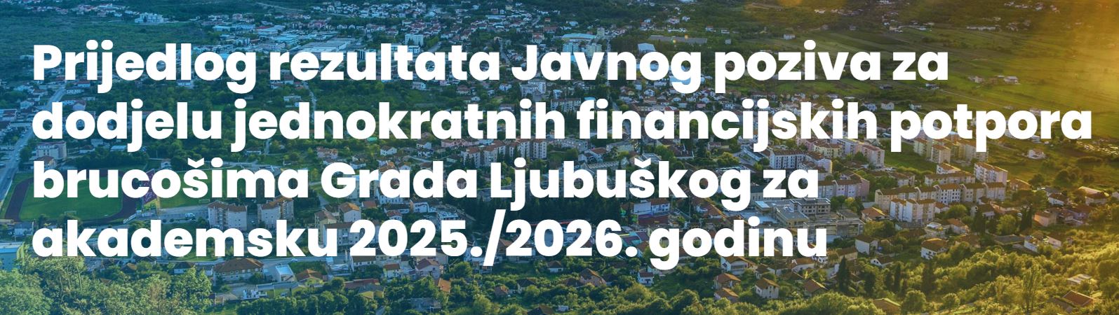 Na temelju članka 7. Odluke o dodjeli jednokratnih financijskih potpora brucošima Grada Ljubuškog za akademsku 2025./2026. godinu („Službeni glasnik Grada Ljubuškog” broj: 4/25) a u svezi sa Javnim pozivom za dodjelu jednokratnih financijskih potpora brucošima Grada Ljubuškog, broj: 02-05-2742/25 od 22.10.2025. godine, Gradonačelnik Grada Ljubuškog o b j a v lj u j e