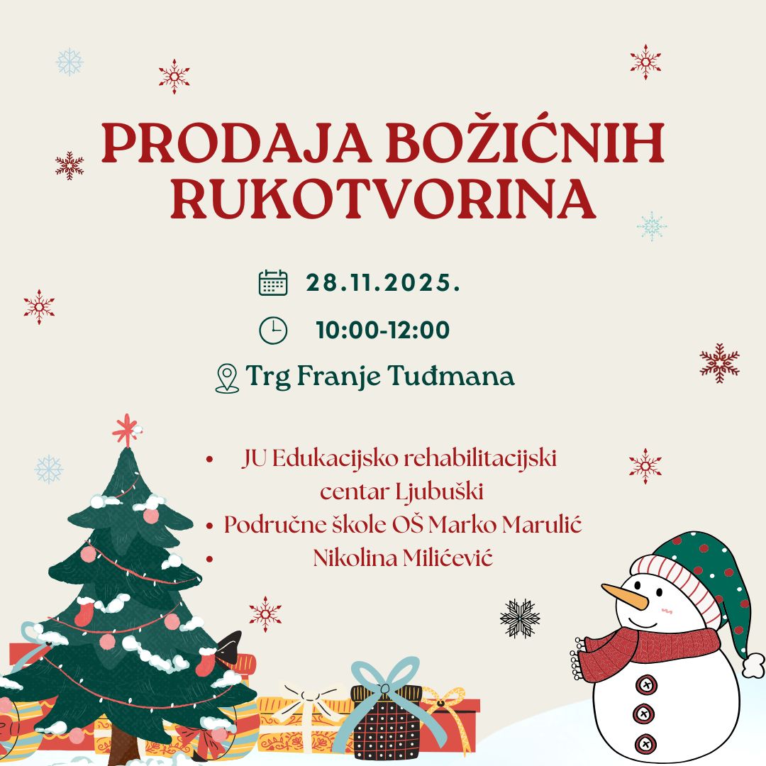 U petak, 28. studenoga 2025. godine, na Trgu dr. Franje Tuđmana u Ljubuškom bit će održana humanitarna prodaja božićnih rukotvorina, u organizaciji JU Edukacijsko-rehabilitacijskog centra Ljubuški i Područne škole OŠ Marka Marulića Donji Radišići, te Nikoline Milićević.