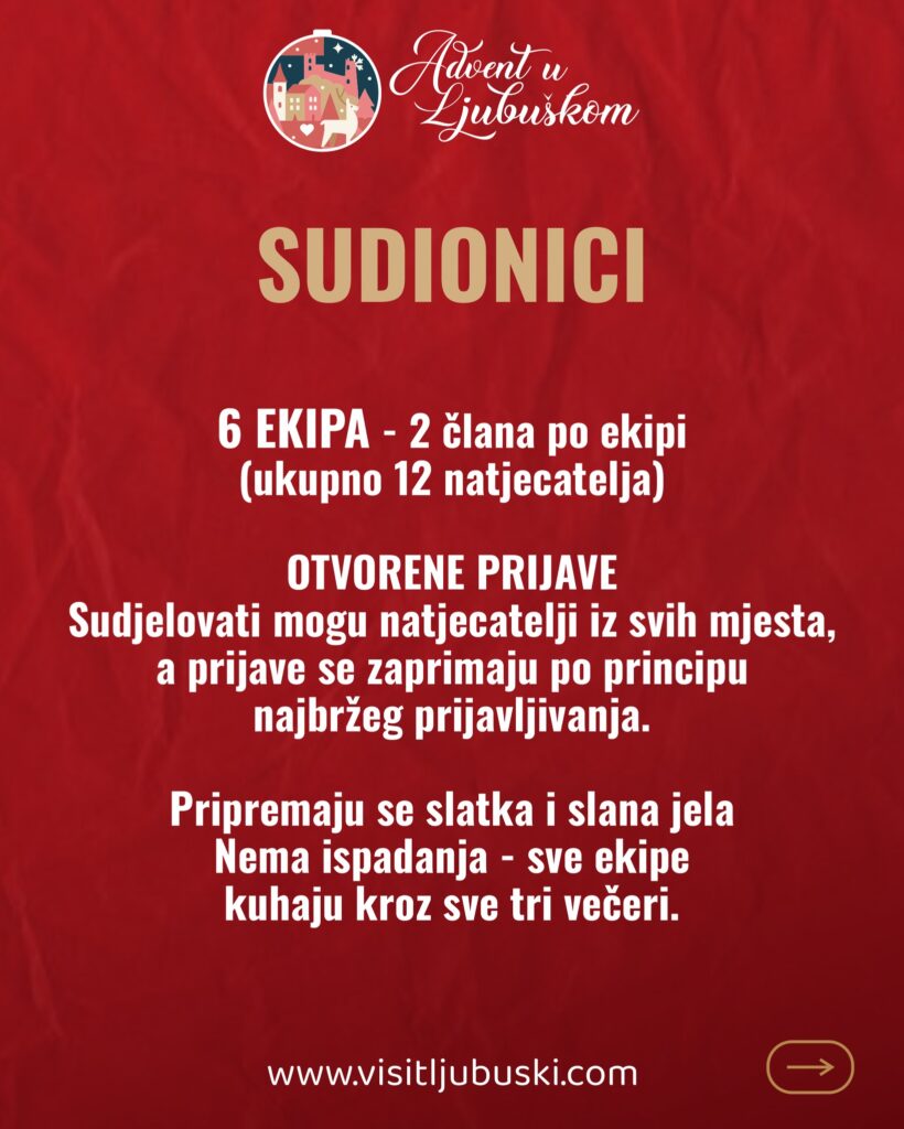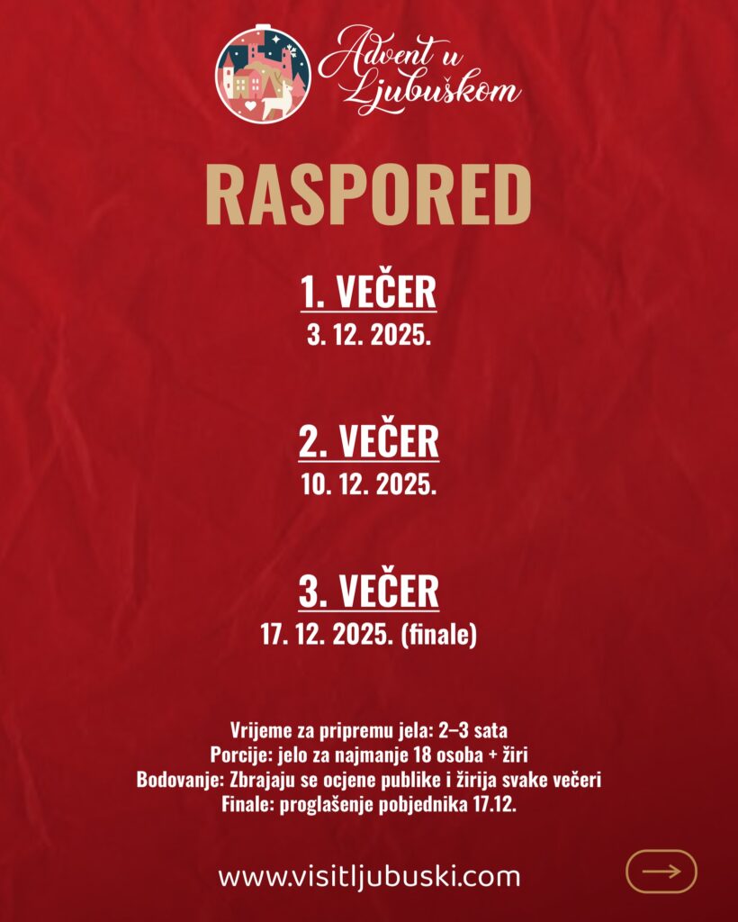 Turistička zajednica Ljubuški s ponosom najavljuje Adventsko natjecanje u kuhanju – OKUSI ZAVIČAJA, jedinstveni gastro-show koji će u prosincu obogatiti program Adventa u Ljubuškom. Natjecanje će se održati kroz tri večeri — 3., 10. i 17. prosinca 2025., na Trgu dr. Franje Tuđmana, uz sudjelovanje šest timova koji će publici i žiriju predstaviti najbolje okuse svog zavičaja.