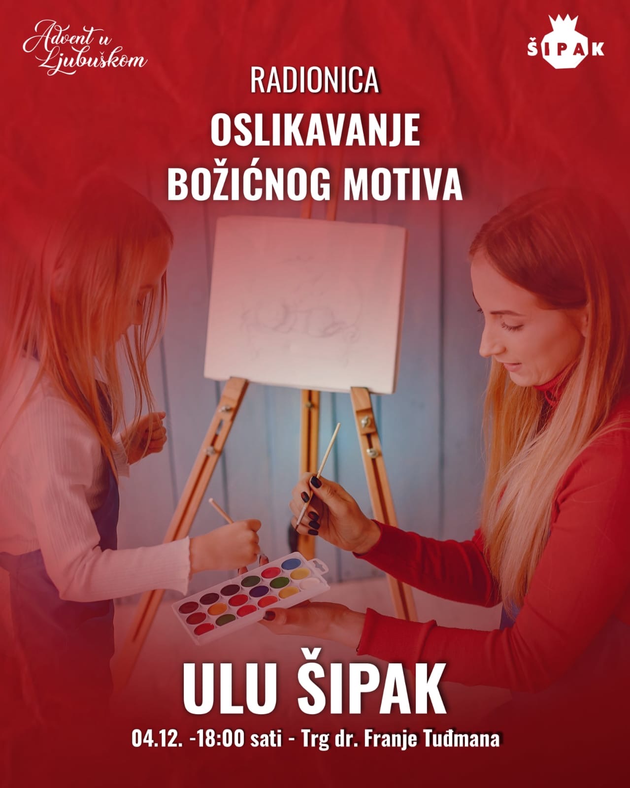 U sklopu manifestacije Advent u Ljubuškom pozivamo vas na kreativnu radionicu oslikavanja božićnog motiva, posebno osmišljenu kao prekrasno zajedničko iskustvo za roditelja i dijete. Kroz zabavne i jednostavne slikarske tehnike, sudionici će imati priliku zajedno stvarati, učiti i uživati u blagdanskom duhu.
