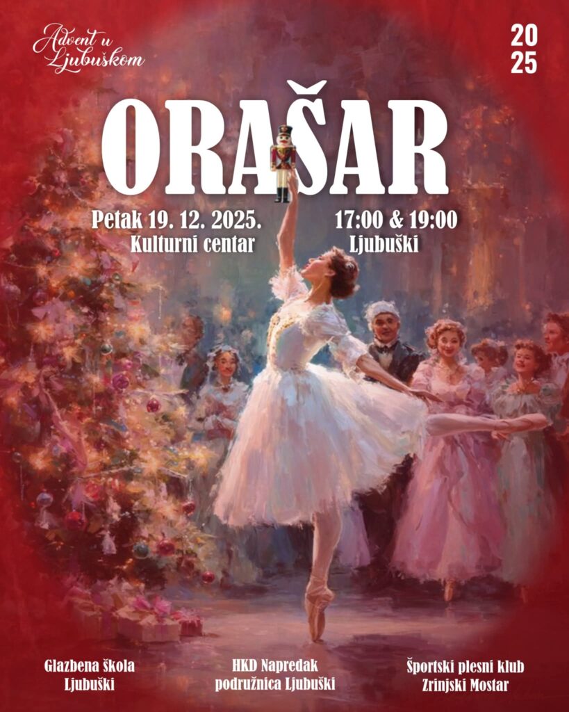 Kroz 10 glazbeno-scenskih slika, uz prekrasne aranžmane bezvremenskih poznatih melodija i divnu koreografiju malih balerina i baletana, balet Orašar nam u punom sjaju donose mlade domaće snage. Na scenu izlazi više od 40 izvođača – učenici Glazbene škole Ljubuški, plesači ŠPK Zrinjski Mostar i izvanrednog odjeljenja Prve Baletske škole „Zrinjski Mostar“.Doživite Orašara uživo u Ljubuškom i podržite trud i rad naših malih umjetnika!