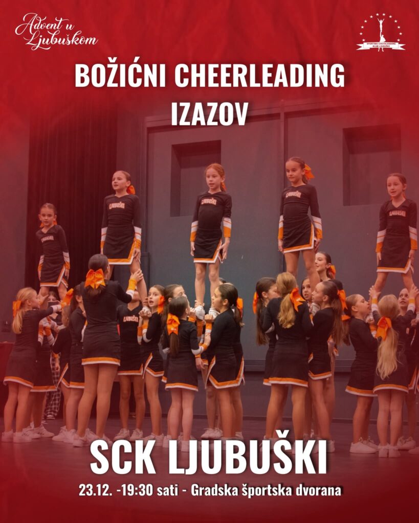 Pozivamo vas na dinamičan, energičan i blagdanski Božićni Cheerleading Izazov u organizaciji SCK Ljubuški! Uživajte u atraktivnim nastupima, timskom duhu i impresivnim akrobacijama koje će izvesti mlade sportašice i sportaši, stvarajući pravu božićnu sportsku atmosferu.Ovaj događaj idealna je prilika za sve ljubitelje plesa, ritma i pozitivne energije da podrže lokalne ekipe i prepuste se zabavi.