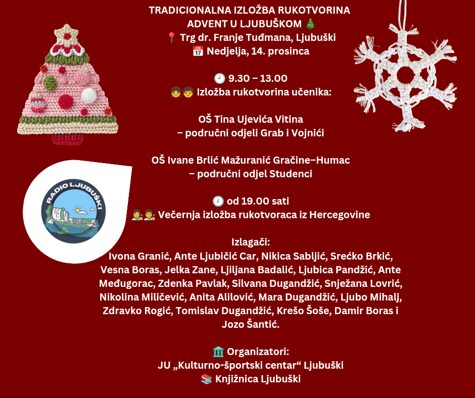 U organizaciji JU „Kulturno-športski centar“ Ljubuški i Knjižnice Ljubuški, u nedjelju 14. prosinca na Trgu dr. Franje Tuđmana u Ljubuškom bit će održana tradicionalna izložba rukotvorina rukotvoraca s područja Hercegovine.
