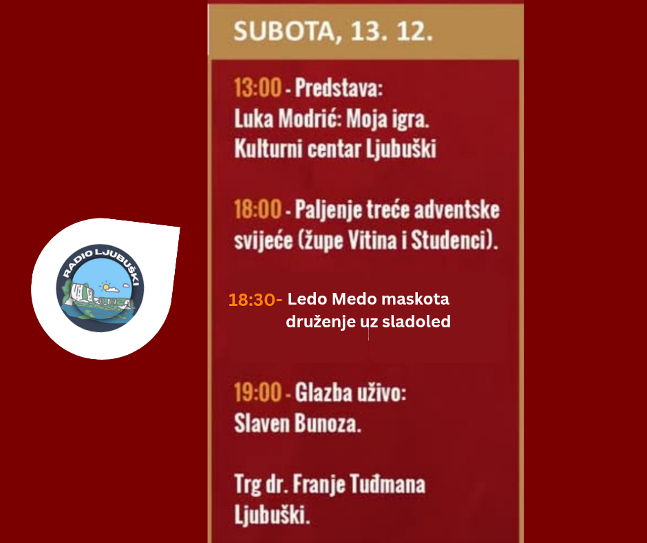 U sklopu Adventa u Ljubuškom, Grad Ljubuški te župe Vitina i Studenci pozivaju vas večeras na zajedničko paljenje treće adventske svijeće. Zastanimo na trenutak, okupimo se i u miru i molitvi uđimo u treću adventsku nedjelju, ispunjenu nadom i blagdanskim duhom.Uz prigodan duhovni program i topli adventski ugođaj, dopustimo da svjetlo svijeće osvijetli put prema Božiću. Radujemo se vašem dolasku!