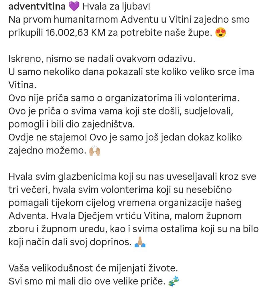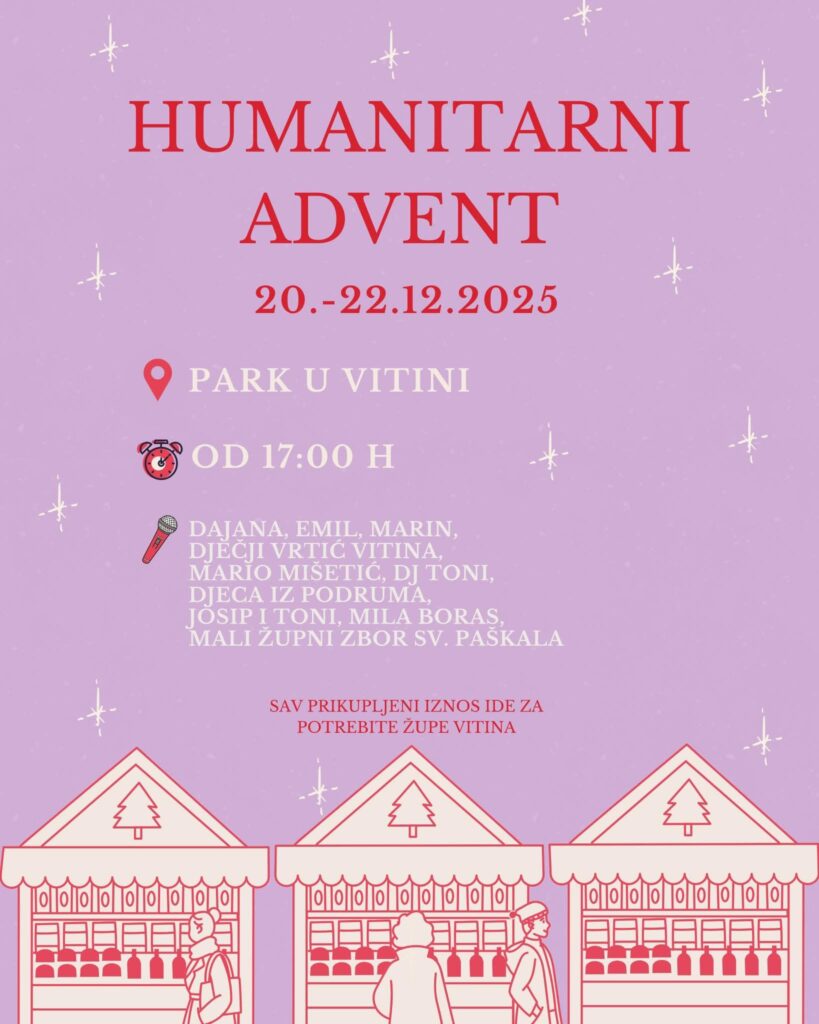 U Vitini je od 20. do 22.prosinca 2025. održan Humanitarni advent koji je okupio velik broj mještana.Tijekom tri dana ispunjena prigodnim druženjem, sudionici su svojim sudjelovanjem pokazali veliko srce za one kojima je pomoć najpotrebnija.Posebno vrijedan rezultat ovog adventa je prikupljenih 16.002,63 KM, koje će biti usmjerene za pomoć potrebitim obiteljima i pojedincima u župi Vitina. Poveznica na Instagram: