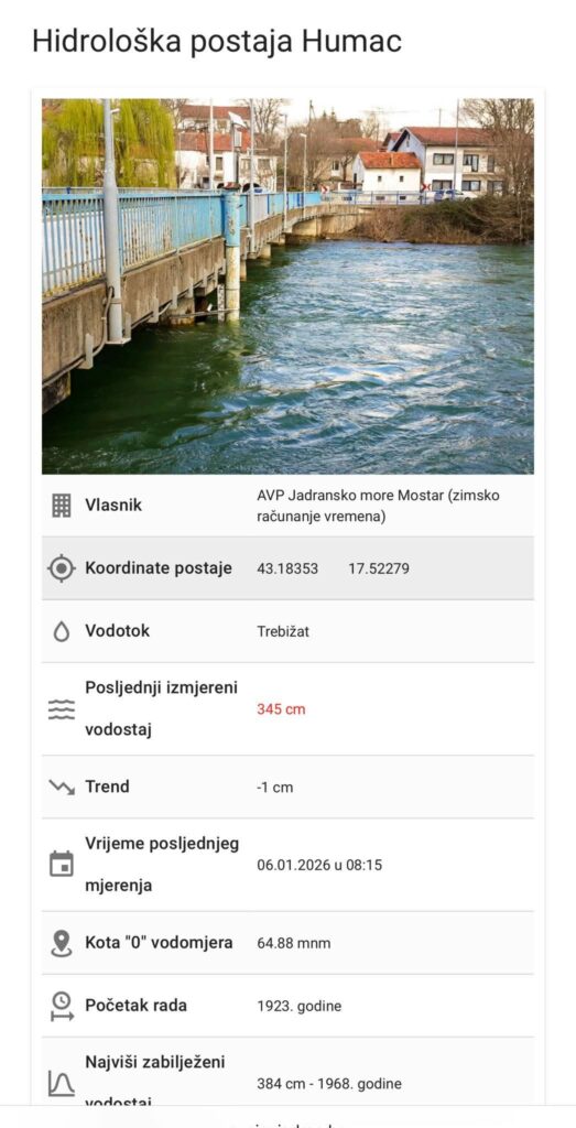 Trenutni vodostaj 05.01.2026 u 12:00 , HMP Humac = 336cm .