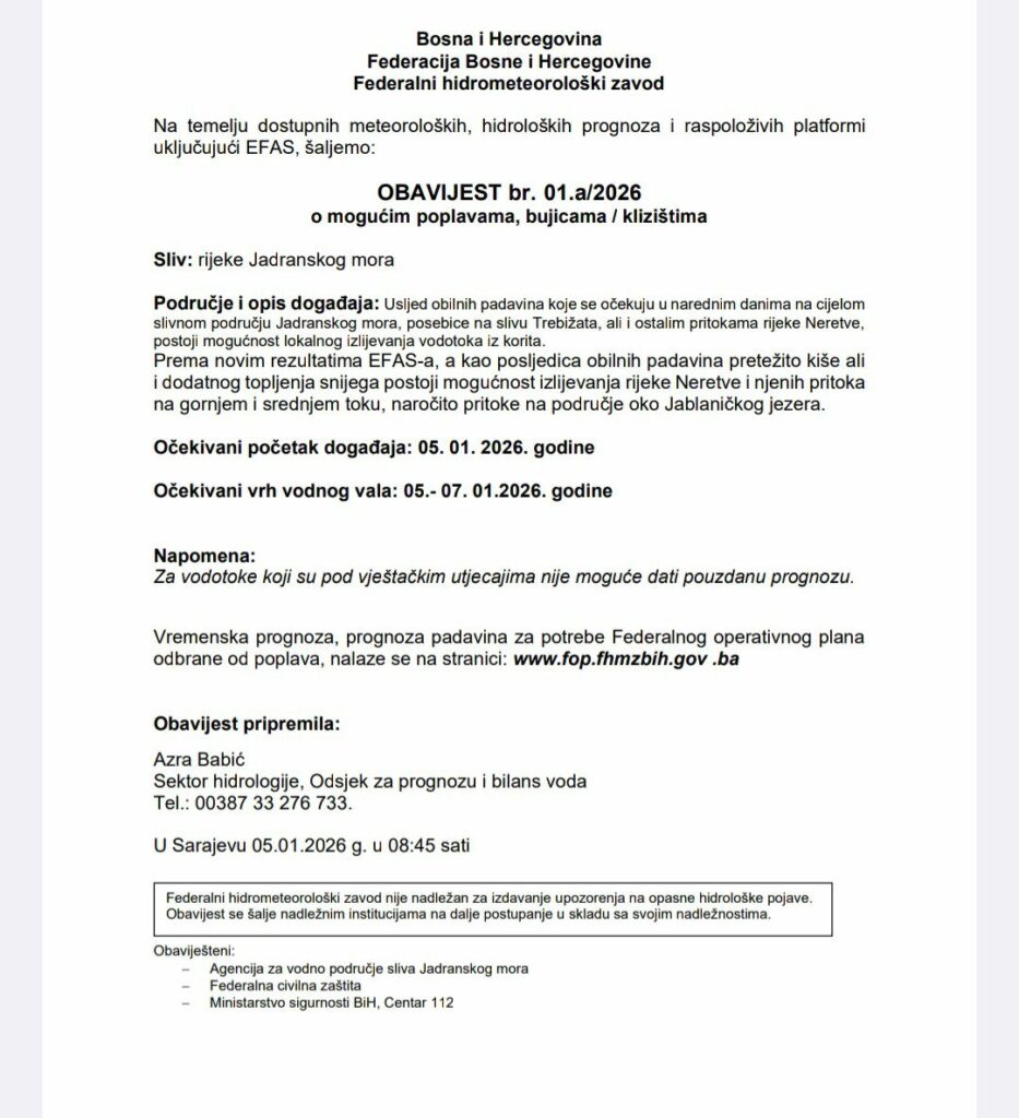 Federalni hidrometeorološki zavod je danas izdao Obavijest o mogućim poplavama bujicama i klizištima koje se odnose na sliv Jadranskog mora. U obavijesti se navodi da, usljed obilnih padavina koje se očekuju u narednim danima na cijelom slivnom području Jadranskog mora, a posebno na slivu Trebižata, kao i na ostalim pritokama rijeke Neretve, postoji mogućnost lokalnog izlijevanja vodotoka iz korita.