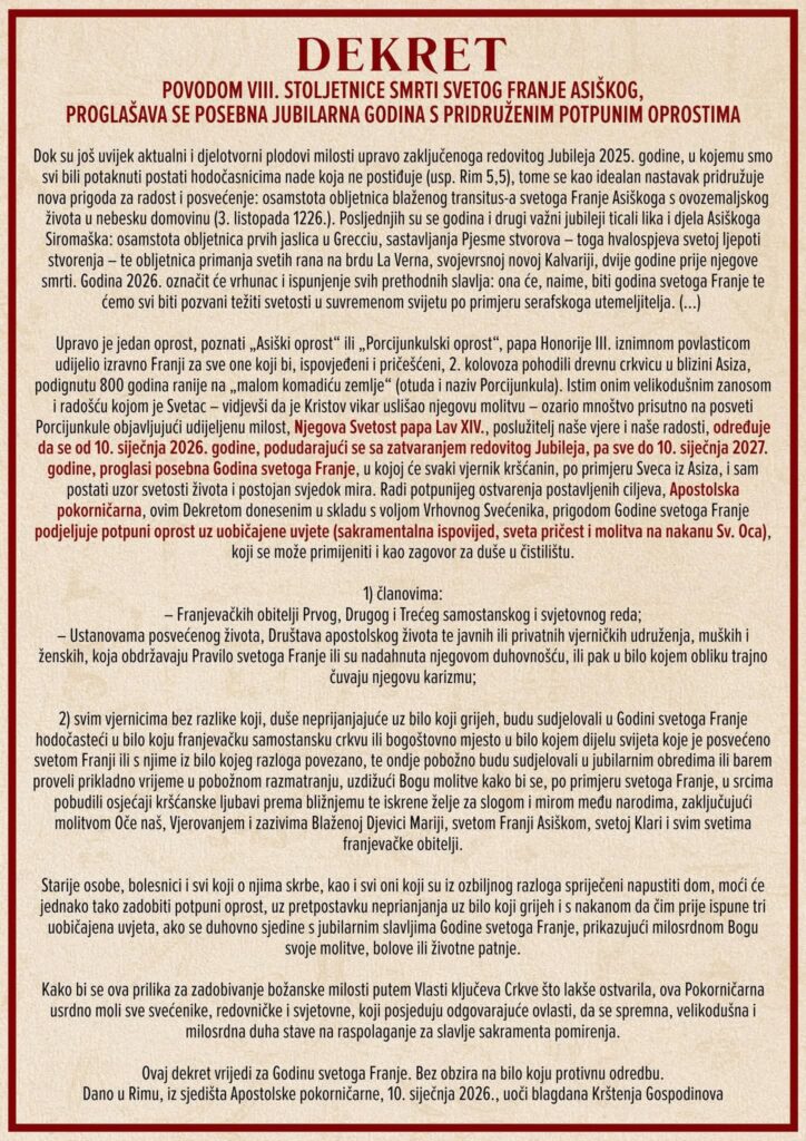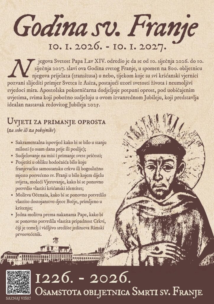 U u novoj 2026. godini naša crkva na Humcu ostaje mjesto primanja potpunog oprosta povodom proglašenja godine sv. Franje o 800. obljetnici njegove smrti.
