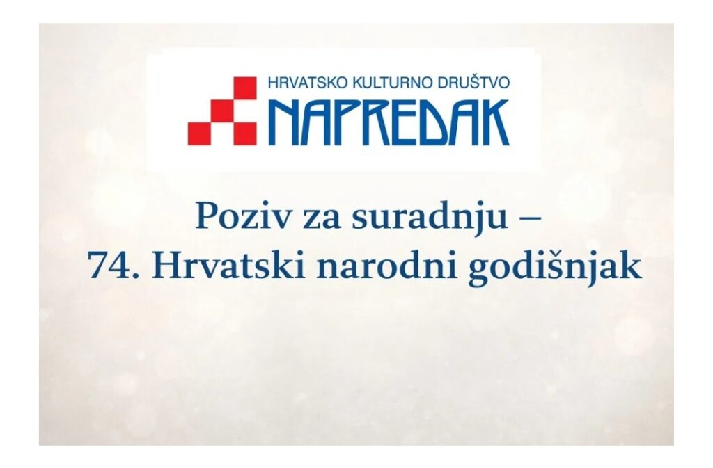 Hrvatski narodni godišnjak, najdugovječnije glasilo Hrvatskog kulturnog društva Napredak, koje izlazi još od 1907. godine, tradicionalna je publikacija koja kontinuirano bilježi sve ono što je bitno za život Društva, a samim time i za kulturna, znanstvena i društvena zbivanja u široj zajednici.Uredništvo Hrvatskog narodnog godišnjaka poziva članove HKD Napredak, suradnike, znanstvenike, umjetnike, kulturne djelatnike i sve zainteresirane autore da svojim tekstovima, kao i jednom fotografijom (najmanje 1 MB, što bolje kvalitete), sudjeluju u kreiranju 74. broja Hrvatskog narodnog godišnjaka, čije je objavljivanje planirano tijekom 2026. godine.
