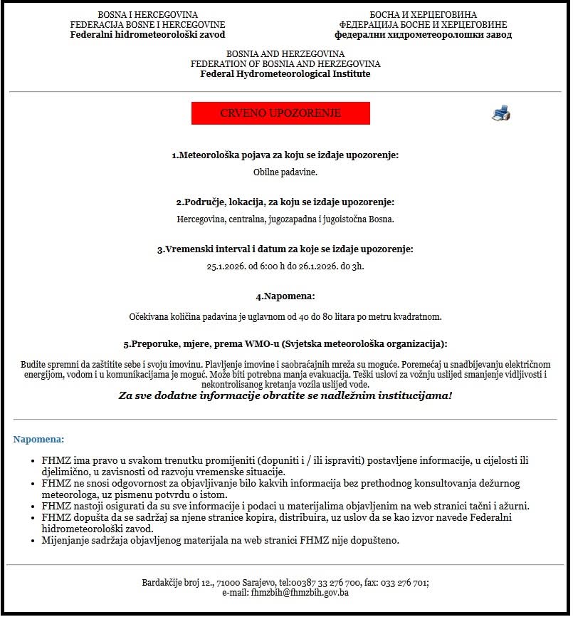Prema izvješćima nadležnih institucija Federacije BiH, Federalne uprave civilne zaštite i Federalnog hidrometeorološkog zavoda, izdano je crveno upozorenje za područje Hercegovine, kao i središnje, jugozapadne i jugoistočne Bosne, zbog najavljenih obilnih oborina.
