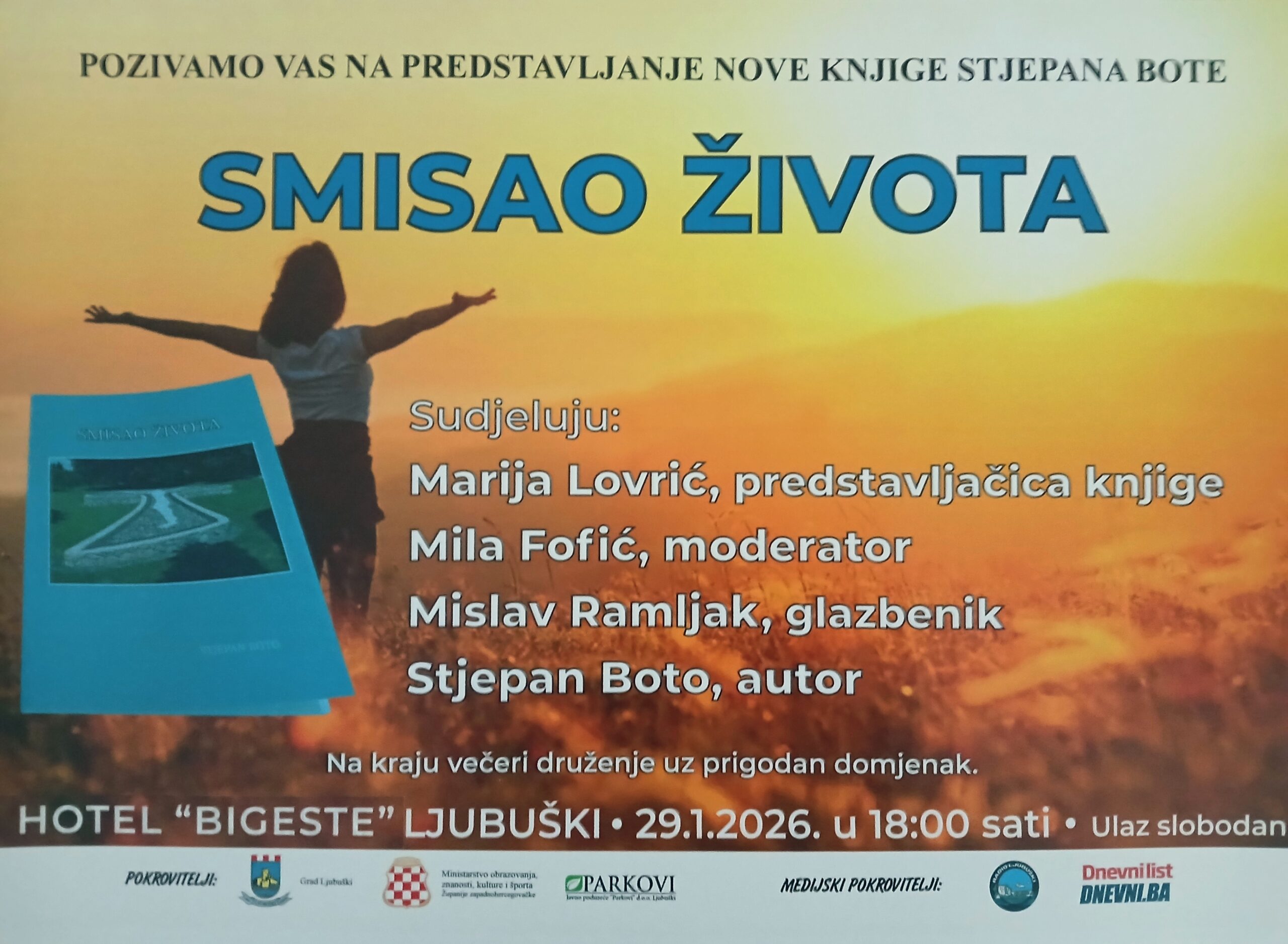 Ljubitelji poezije imat će priliku upoznati novo književno ostvarenje Stjepana Bote na predstavljanju njegove knjige Smisao života, koje će se održati u hotelu Bigeste u četvrtak, 29. siječnja s početkom u 18 sati. Stjepan Boto autor je zbirke poezije Pjesme duše i srca iz 2021. godine, a knjiga Smisao života njegova je druga objavljena knjiga.