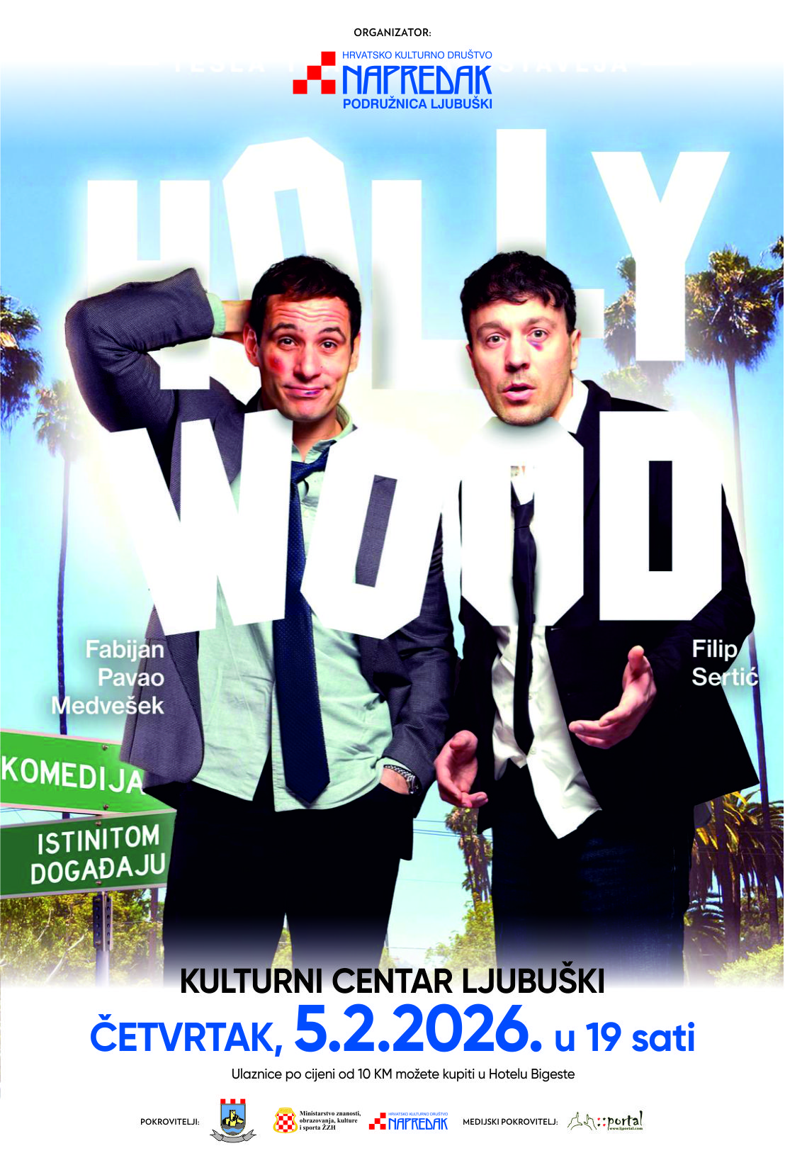 Dva prijatelja glumca odluče ostvariti “Američki san” i preseliti u Los Angeles. Predstava prati njihovu avanturu – koga će sve od slavnih ličnosti upoznati, kako će se snaći i hoće li uspjeti ili ipak propasti? Povjerit će vam iz prve ruke zašto im se Tom Cruz zamjerio, kako je raditi s Meryl Streep i kakav je Brad Pitt kad se ugase kamere. Predstava je svojevrsni hommage Hollywoodu – centru zabavne industrije i inspirirana je brojnim poznatim scenama iz omiljenih filmova te nadahnuta poznatom filmskom glazbom. Urnebesna priča o prijateljstvu, snalaženju, Hollywoodu i glamuru s poznatim dvojcem s malih ekrana, čeka vas u Ljubuškom.
