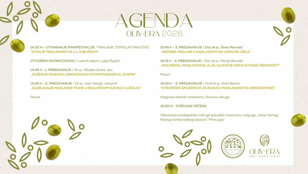Kao krunu aktivnosti u 2026. godini, Udruga maslinara Ljubuški organizira prvu OLIV·ERA manifestaciju, koja će se održati ove subote, 7. veljače 2026. godine u hotelu Bigeste. Riječ je o prvom događaju ovakvog tipa u Ljubuškom, zamišljenom kao središnje godišnje okupljanje maslinara, stručnjaka i svih zaljubljenika u maslinu. Organizatori manifestaciju vide kao temelj buduće tradicije te platformu za razmjenu znanja, iskustava i ideja, ali i snažan alat za jačanje prepoznatljivosti ljubuškog maslinovog ulja.