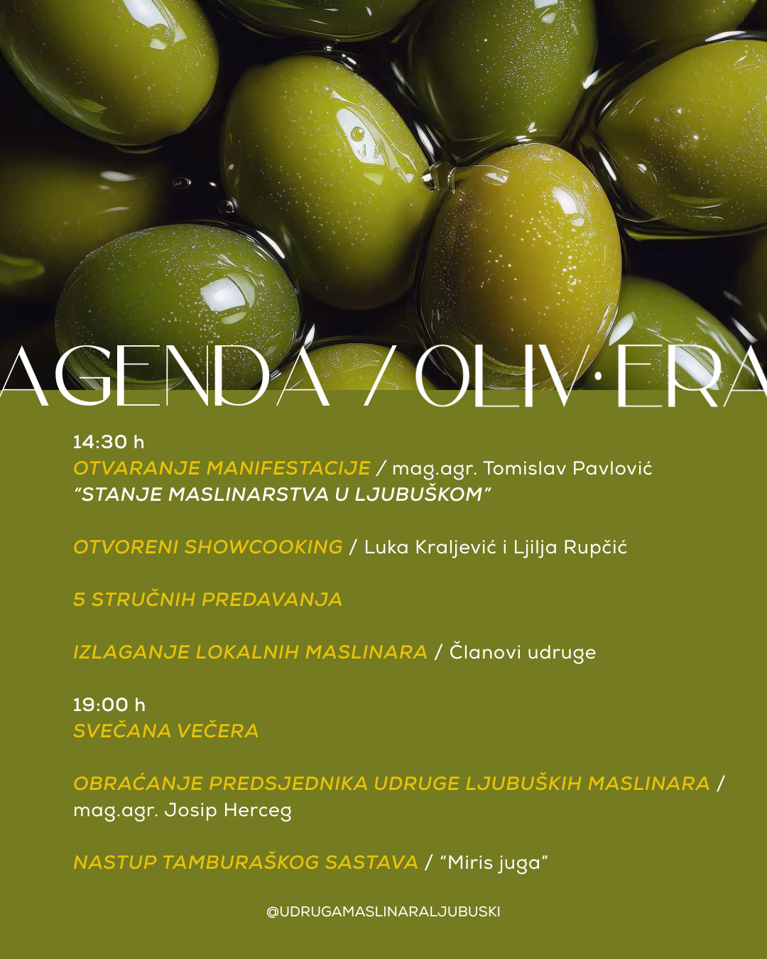 Kao krunu aktivnosti u 2026. godini, Udruga maslinara Ljubuški organizira prvu OLIV·ERA manifestaciju, koja će se održati ove subote, 7. veljače 2026. godine u hotelu Bigeste. Riječ je o prvom događaju ovakvog tipa u Ljubuškom, zamišljenom kao središnje godišnje okupljanje maslinara, stručnjaka i svih zaljubljenika u maslinu. Organizatori manifestaciju vide kao temelj buduće tradicije te platformu za razmjenu znanja, iskustava i ideja, ali i snažan alat za jačanje prepoznatljivosti ljubuškog maslinovog ulja.