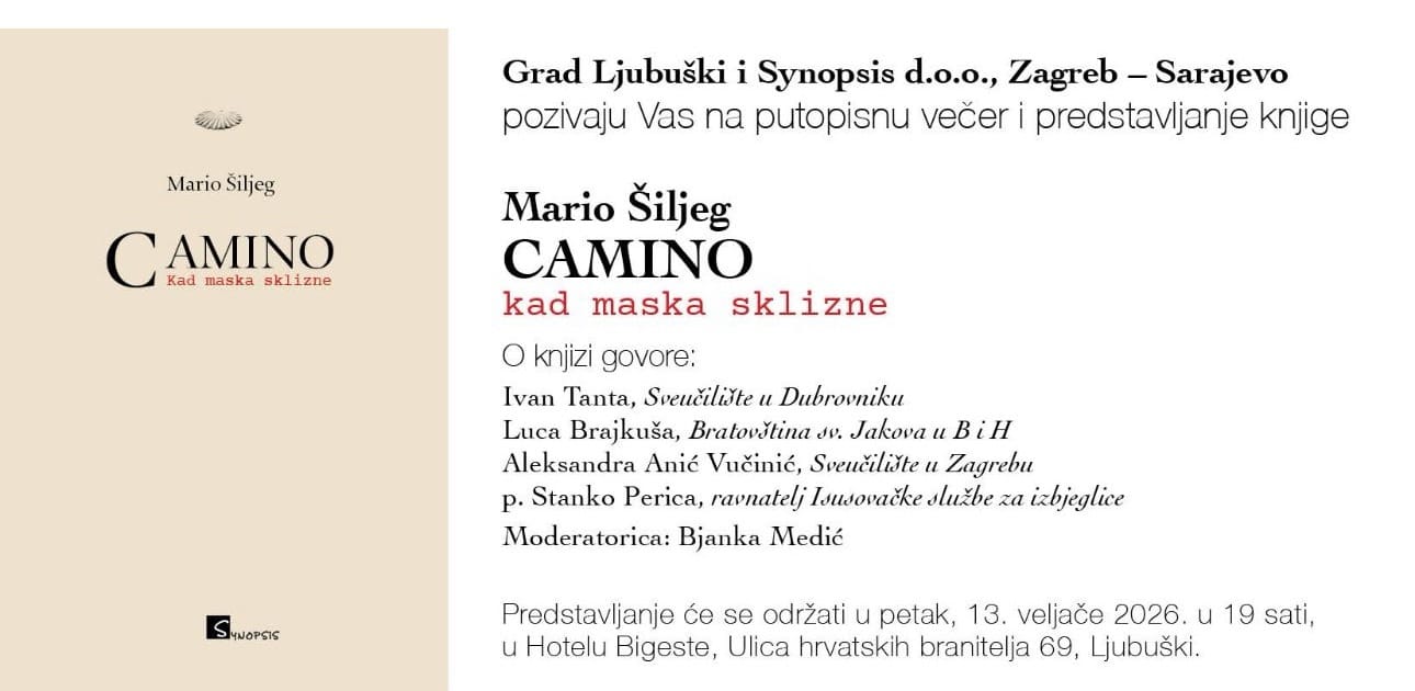 U sklopu programa obilježavanja Dana Grada, Grad Ljubuški poziva čitatelje na putopisnu večer i predstavljanje knjige „Camino – kad maska sklizne” autora Marija Šiljega. Predstavljanje će se održati u petak, 13. veljače 2026. u 19 sati u Hotelu Bigeste u Ljubuškom.