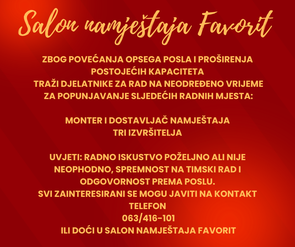 Svi zainteresirani se mogu javiti na kontakt telefon 063/416-101 ili doći u Salon namještaja Favorit.