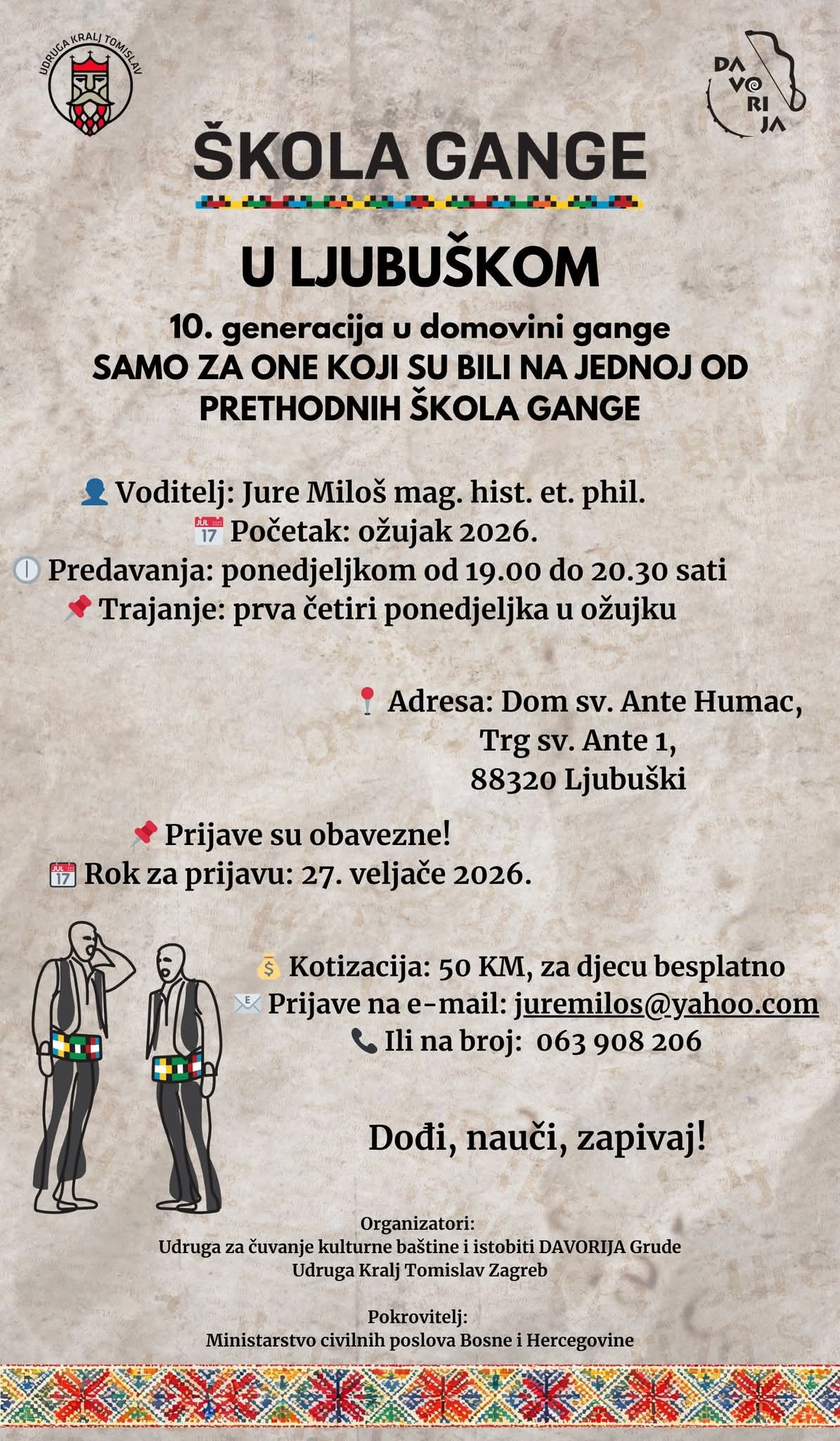 Pozivamo ljubitelje tradicijske pjesme da nam se ponovo pridruže u “Školi gange” u Ljubuškom, pod stručnim vodstvom Jure Miloša, uz podršku Udruge Kralj Tomislav i Udruge Davorija.