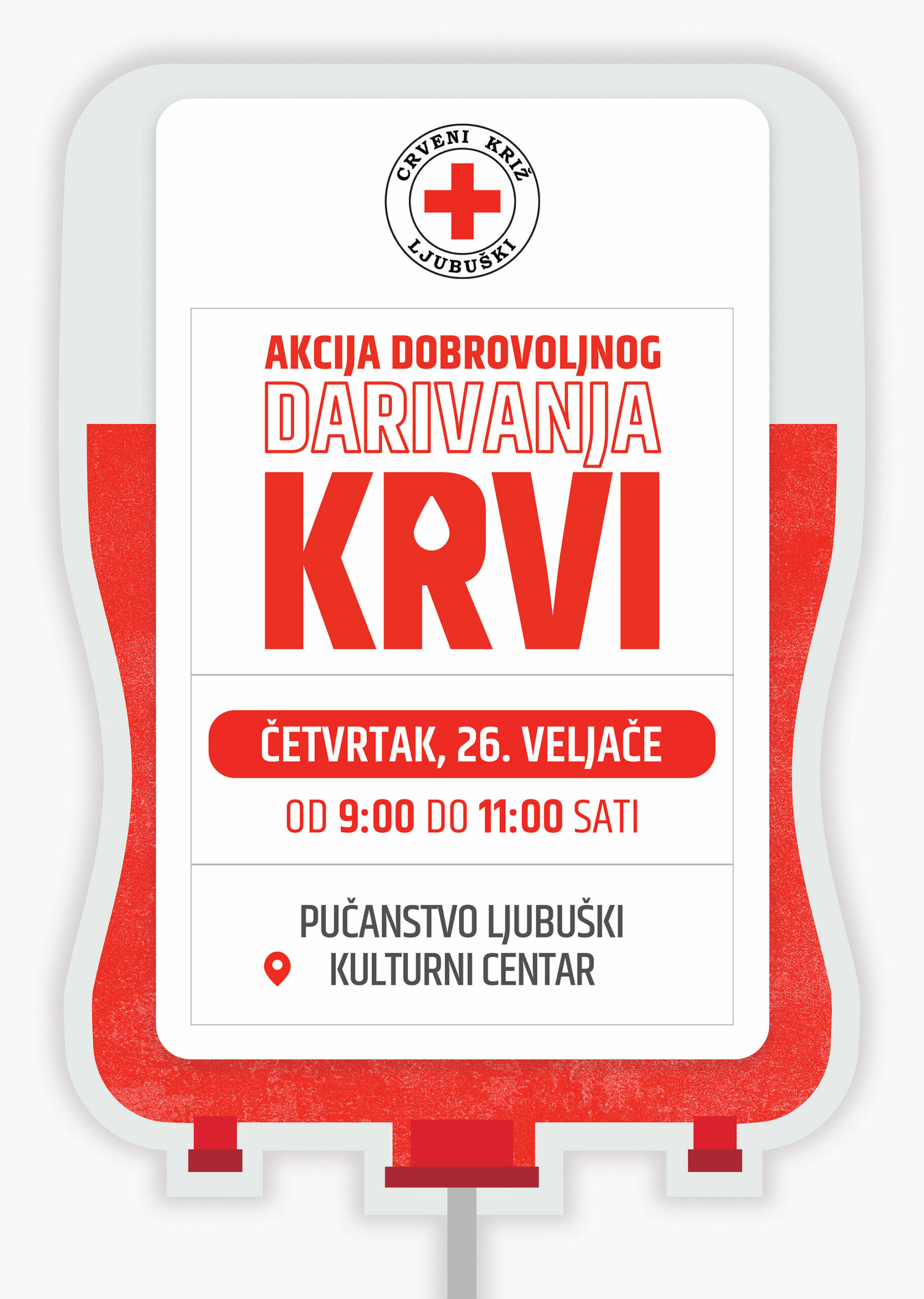 Akcija dobrovoljnog darivanja krvi za pučanstvo Ljubuškoga bit će održana u četvrtak, 26. veljače 2026. godine, od 9:00 do 11:00 sati, u Kulturnom centru Ljubuški (kinodvorana).