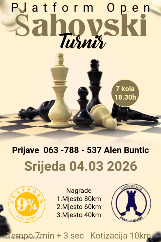 Šahovski klub „Kula“ Ljubuški u srijedu, 4. ožujka, organizira šahovski turnir „Platform open 2026.“.