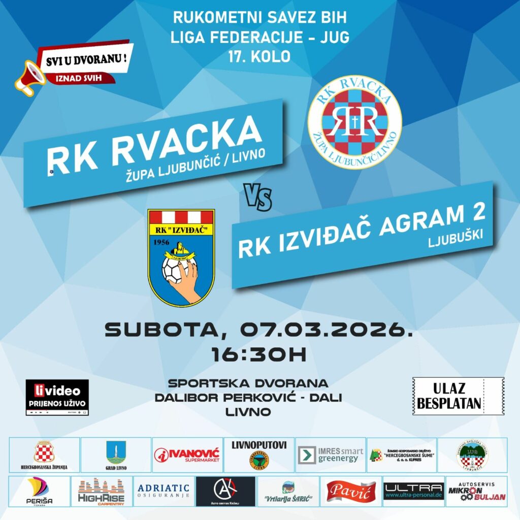 Rukometaši Izviđača 2 u 17. kolu Prve lige F BIH – skupina Jug gostuju kod Rvacke u Livnu. Utakmica se igra u subotu, 7. ožujka,u sportskoj dvorani „Dalibor Perković – Dali“ s početkom u 16,30 sati.