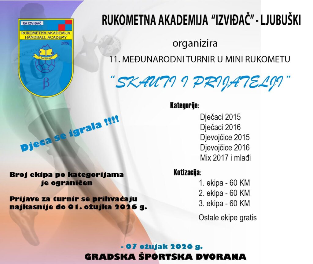 Rukometna akademija Izviđač ovaj vikend organizira 11. Međunarodni rukometni turnir u mini rukometu „Skauti i prijatelji“. Turnir se igra sutra, u subotu, 7. ožujka, u Gradskoj športskoj dvorani u Ljubuškom. Natjecanja će početi u 10 sati, a trebala bi završiti oko 17 sati.
