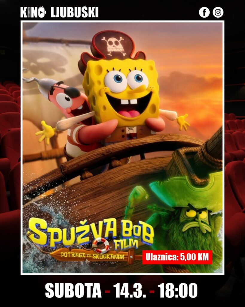 Već od 18 sati na rasporedu je animirani avanturistički film „Spužva Bob Film: Potraga za Skockanim“, u trajanju od 96 minuta. Ulaznica iznosi 5,00 KM. U novom filmskom spektaklu Spužva Bob i njegovi prijatelji iz Koralova kreću u veliku i nezaboravnu pustolovinu. U želji da dokaže svoju hrabrost gospodinu Krabi i pokaže da je „veliki momak“, Spužva Bob prati Letećeg Holanđanina, tajanstvenog duha pirata, na duhovitom putovanju kroz najdublje dubine oceana. Ovaj film donosi šarenu i zabavnu avanturu namijenjenu cijeloj obitelji.