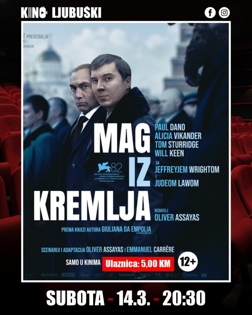 Istoga dana, u večernjem terminu od 20.30 sati, publika će moći pogledati film „Mag iz Kremlja“, političku dramu i triler u trajanju od 2 sata i 25 minuta. Cijena ulaznice također je 5,00 KM, a film je preporučen za uzrast 12+. Riječ je o napetoj priči koja prikazuje kako nastaje i djeluje moć iza kulisa politike. U središtu radnje nalazi se čovjek koji iz sjene sudjeluje u izgradnji političkog sustava moderne Rusije, a film kroz splet intriga, manipulacija i borbe za utjecaj donosi snažan pogled na svijet propagande i moći. U glavnim ulogama nastupaju Paul Dano, Alicia Vikander i Tom Sturridge, uz Jeffreyja Wrighta i Judea Lawa, dok režiju potpisuje Olivier Assayas.