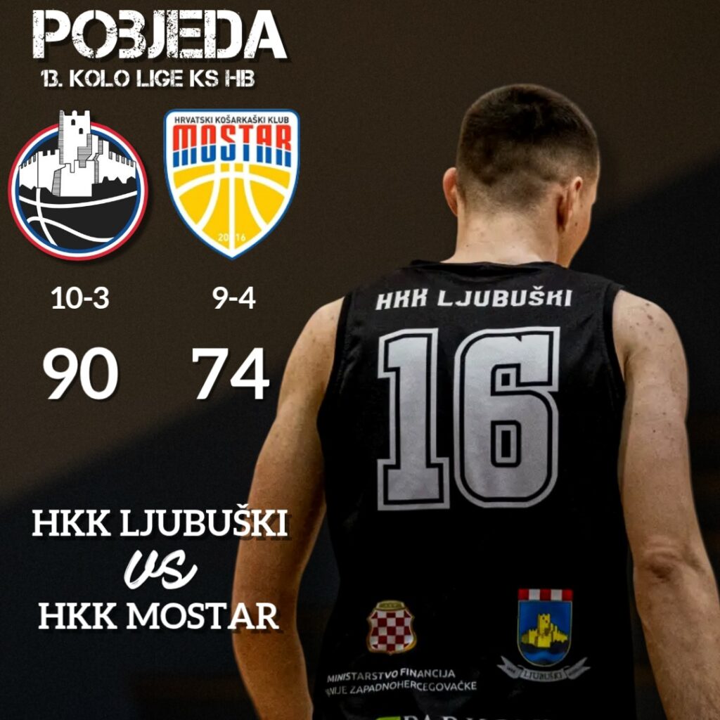 Košarkaši Ljubuškog su jučer u Gradskoj športskoj dvorani u Ljubuškom, u 13. kolu, i derbi susretu cijelog prvenstva KS Herceg-Bosne, svladali Mostar rezultatom 90:74, po četvrtinama je bilo 18:10, 25:31, 21:16 i 26:17.