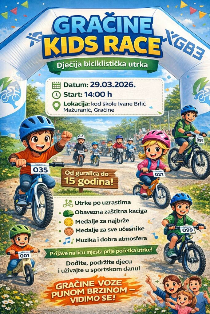 U Gračinama se sprema pravi mali sportski spektakl za najmlađe! U nedjelju, 29. ožujka 2026. godine, s početkom u 14:00 sati, održat će se vesela dječja biciklistička utrka „Gračine Kids Race“, i to na prostoru kod škole Ivane Brlić Mažuranić.