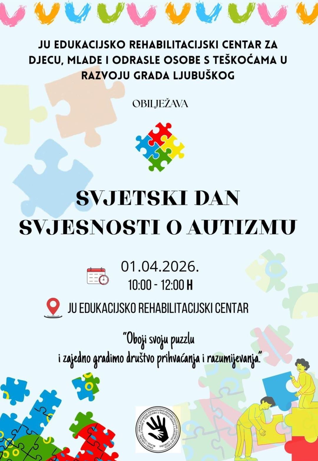 Povodom obilježavanja Svjetskog dan svjesnosti o autizmu JU Edukacijsko rehabilitacijski centar za djecu, mlade i odrasle osobe s teškoćama u razvoju Grada Ljubuški u utorak 01.04.2026. godine će upriličiti prigodnu radionicu u kojoj će sudjelovati korisnici centra i učenici posebnih odijela sa svojim učiteljima i asistentima s područja Grada Ljubuškog .