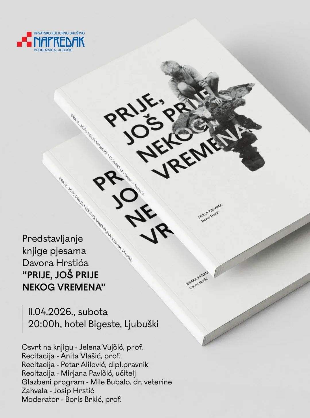 U organizaciji Hrvatskog kulturnog društva Napredak – podružnica Ljubuški, u subotu, 11. travnja 2026. godine, bit će upriličeno predstavljanje zbirke pjesama Davora Hrstića pod nazivom „Prije, još prije nekog vremena“. Program će se održati u hotelu Bigeste u Ljubuškom s početkom u 20 sati.