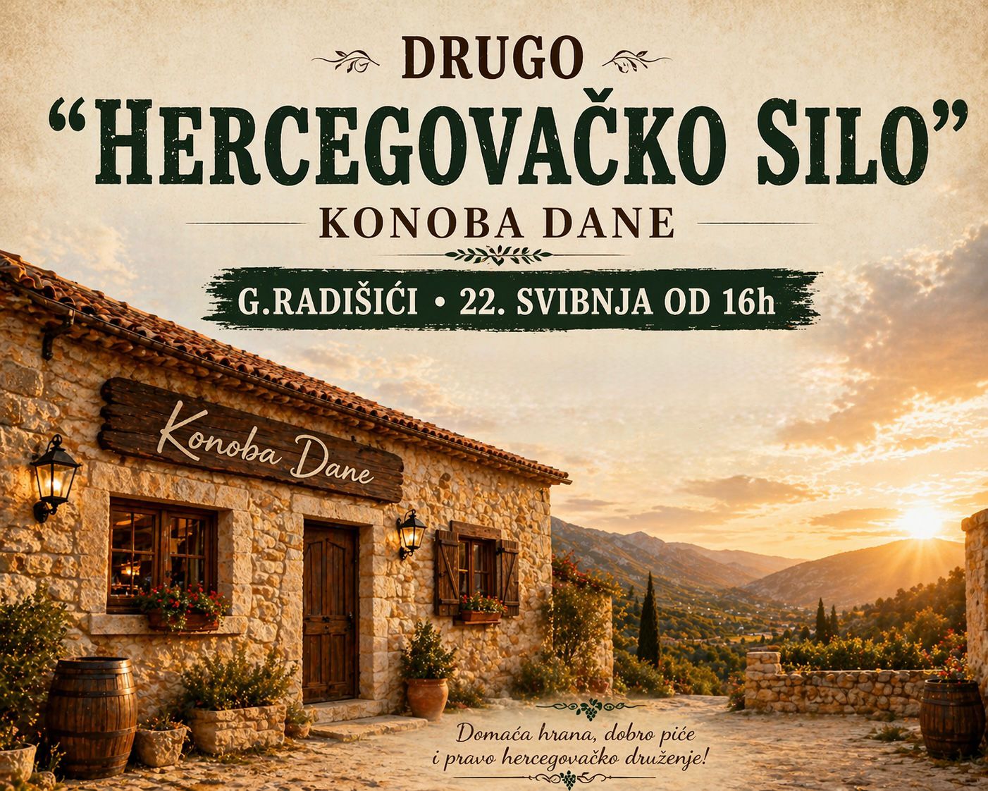 U petak, 22. svibnja 2026. od 16 sati, u Konobi Dane u Gornjim Radišićima održava se 2. Hercegovačko silo; mjesto susreta svih koji vole pjesmu, tradiciju i pravo hercegovačko druženje. Očekuje vas ugodna atmosfera, veselje i doživljaj Hercegovine u njenom punom sjaju.