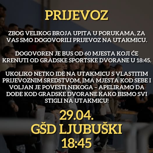 Polazak autobusa kapaciteta 60 mjesta predviđen je u 18:45 sati ispred Gradske športske dvorane u Ljubuškom, a iz kluba su uputili i apel svima koji putuju vlastitim prijevozom da, ukoliko imaju mjesta, povedu još nekoga kako bi što veći broj navijača stigao na utakmicu.